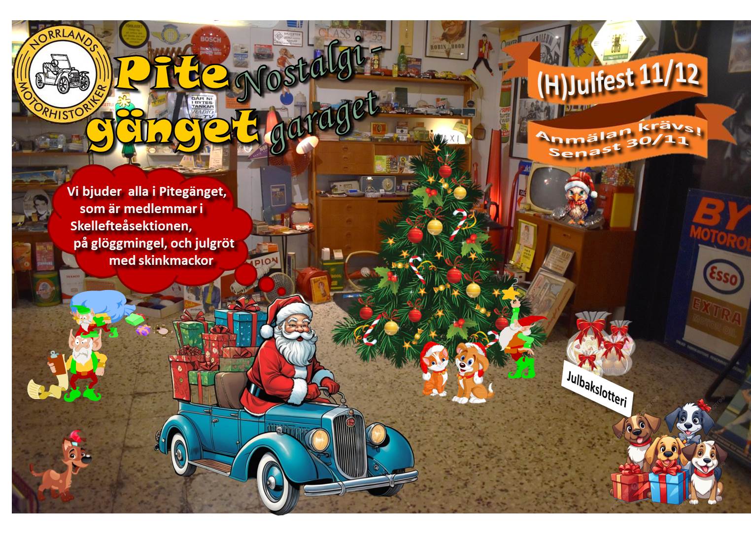 Torsdag 11/12, kl. 18-21, är det (h)julfest för Pitegänget i Nostalgigaraget, Böle.
