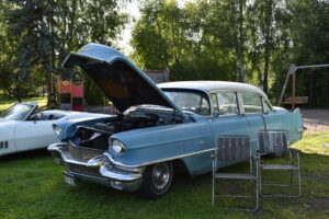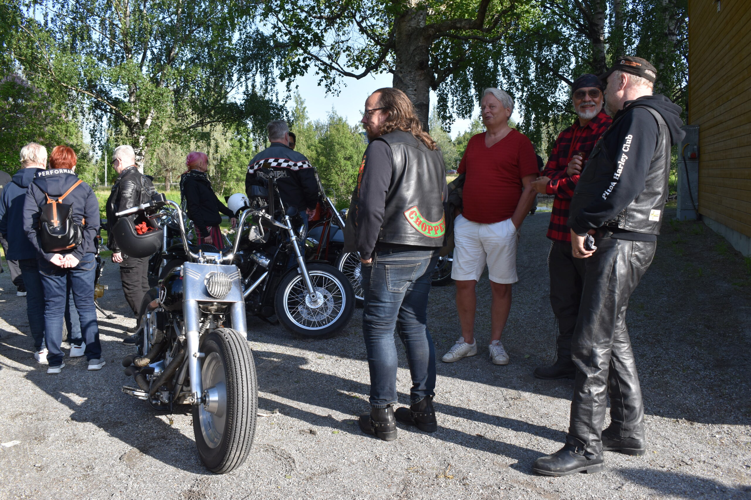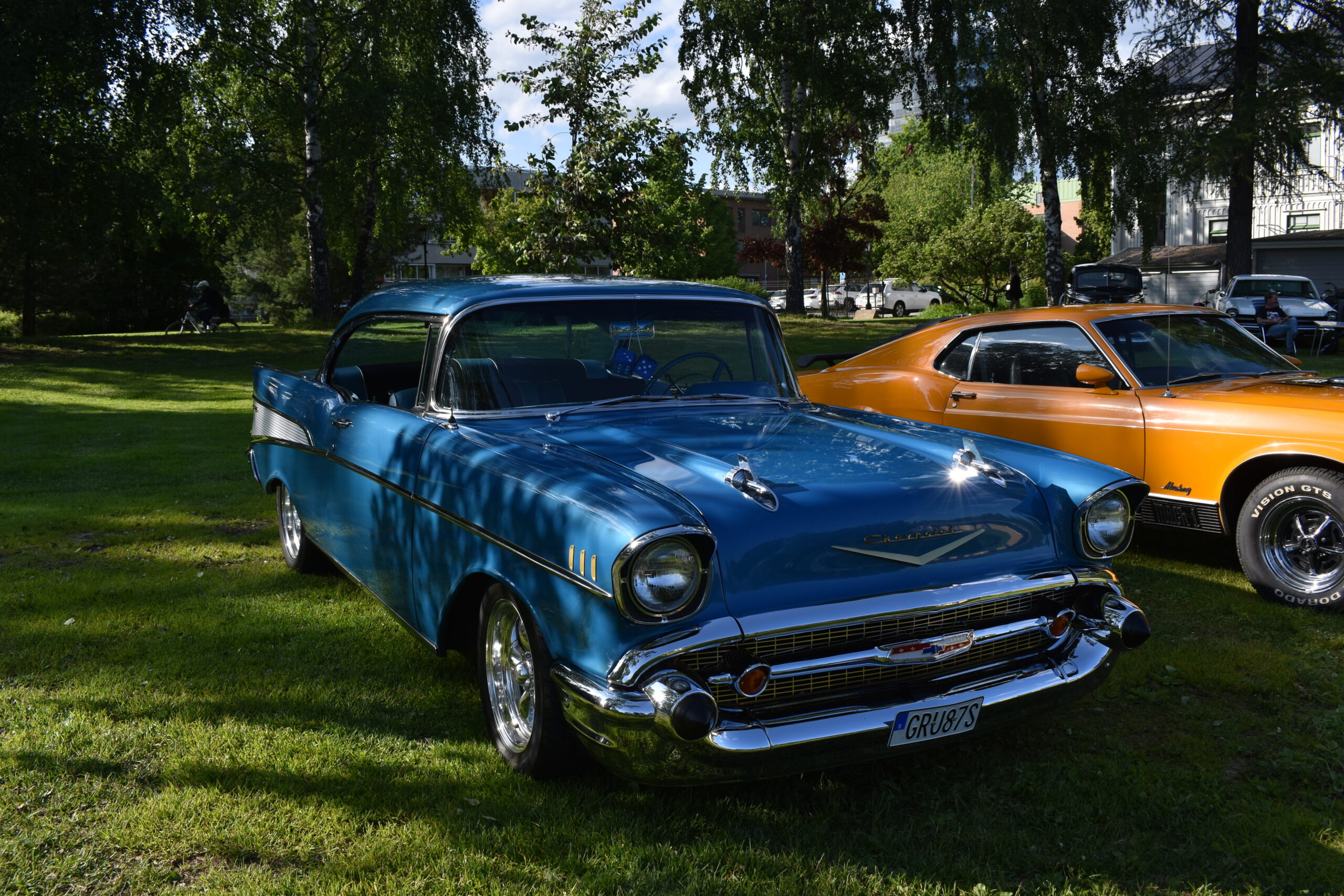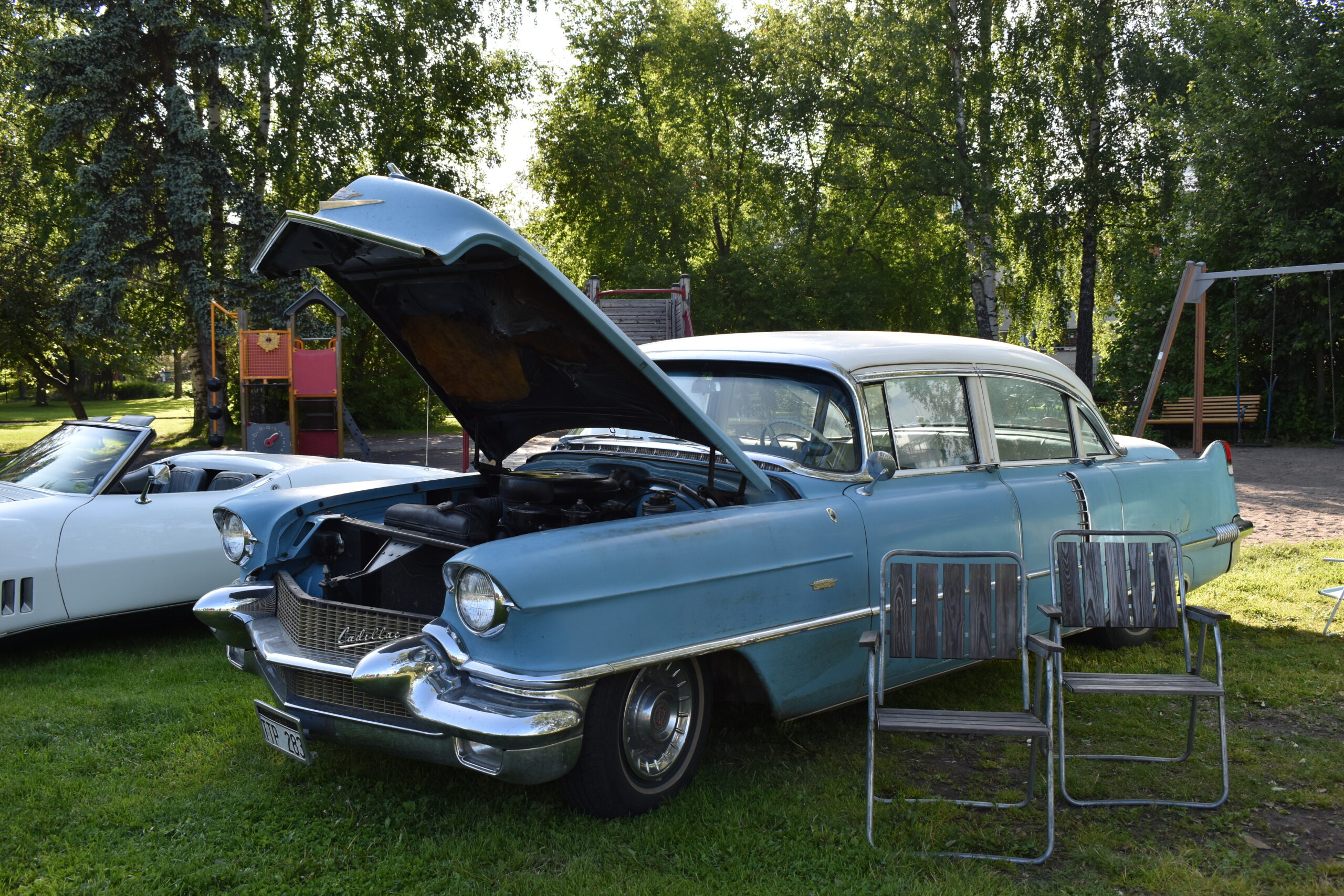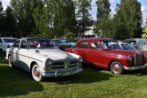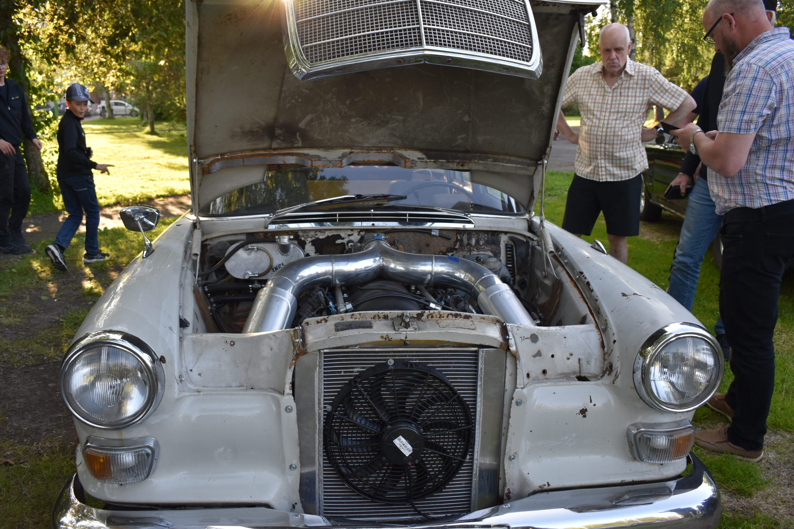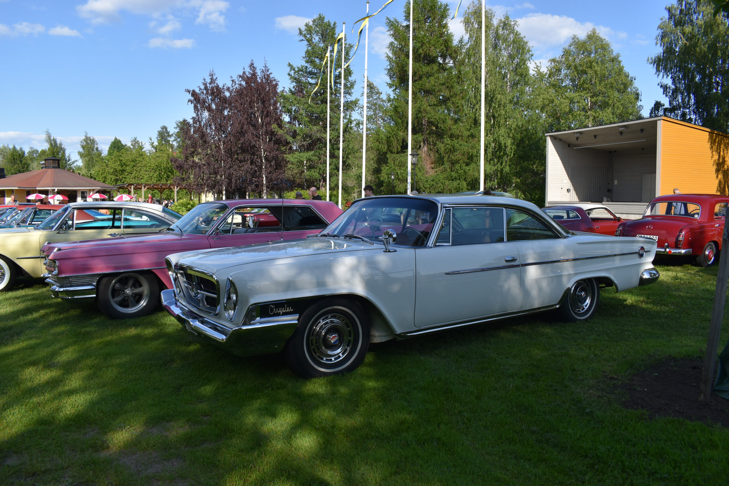 Vilken kväll! En mycket efterlängtad sol lyste från en nästan klarblå himmel och lockade fram bilfolk från när och fjärran. Redan halv fem började bilarna rulla in i parken och parkera i grönskan, och till slut stod hela 145 två, tre och fyrhjuliga fordon och glänste i solskenet. Lite trångt på vissa ställen, men finns det hjärterum så... Alla var på plats idag, gamla motorvänner, nygamla motorvänner och även idag några nya motorvänner. Det var också fullt med glada människor som kom till fots för att titta på fordon och prata motor med oss. Caféet var välbesökt, många passade på att fika pch äta från det rikhaltiga sortimentet. Sen satt vi länge med våra kaffekoppar och njöt av solen och det trevliga sällskapet. Nu får vi hoppas att det vackra sommarvädret håller i sej så ses vi igen nästa Torsdag - samma tid, samma plats.