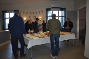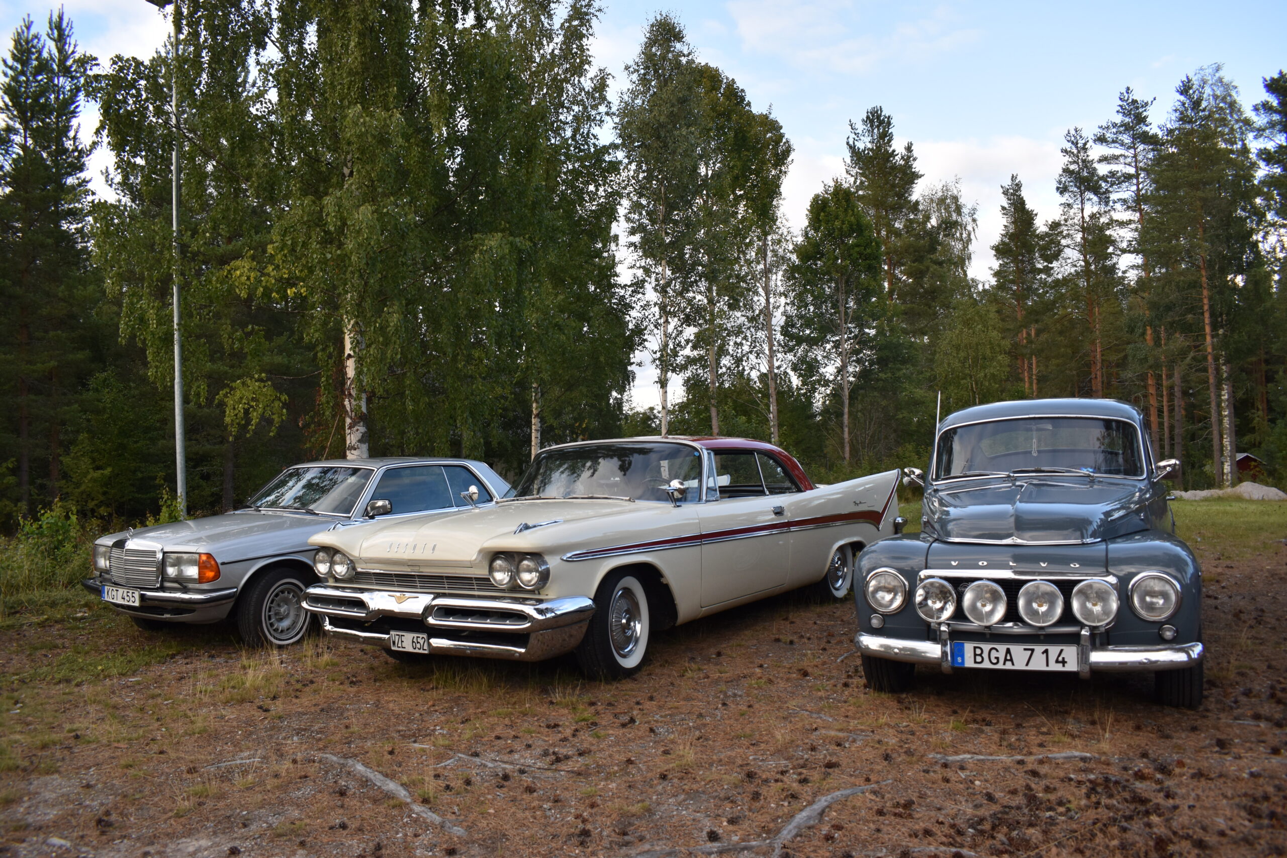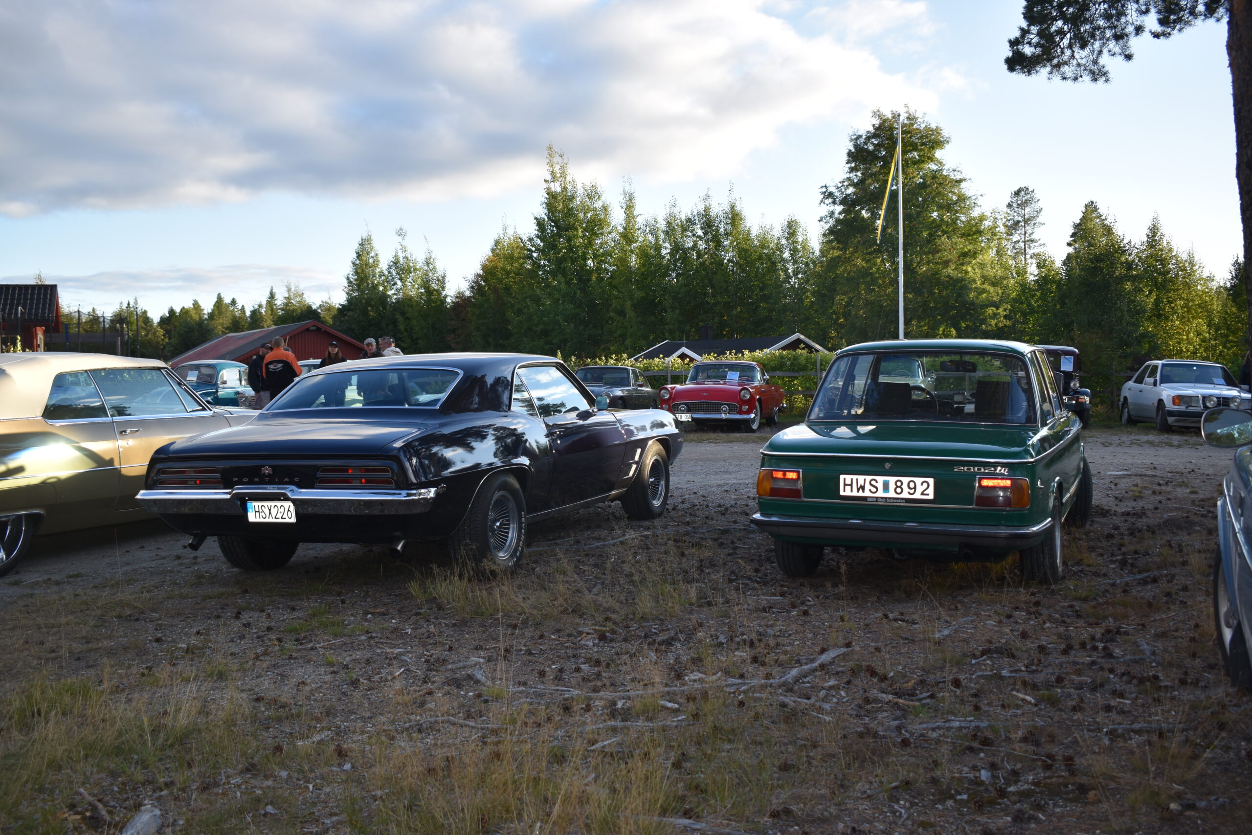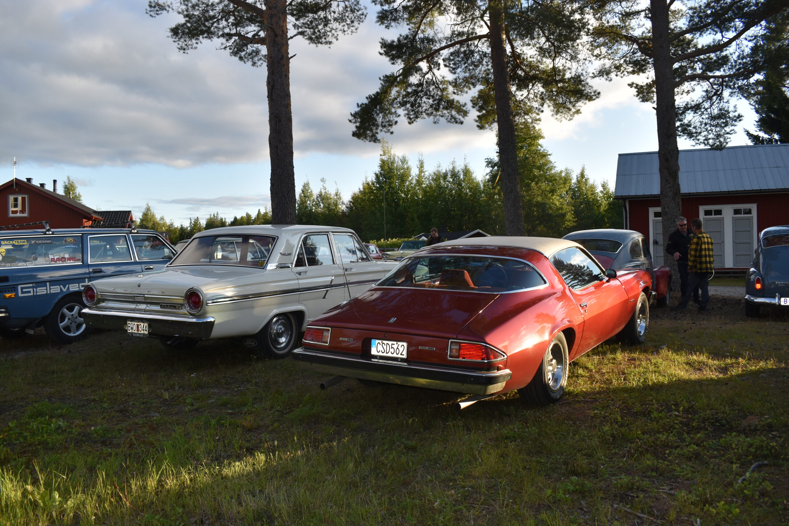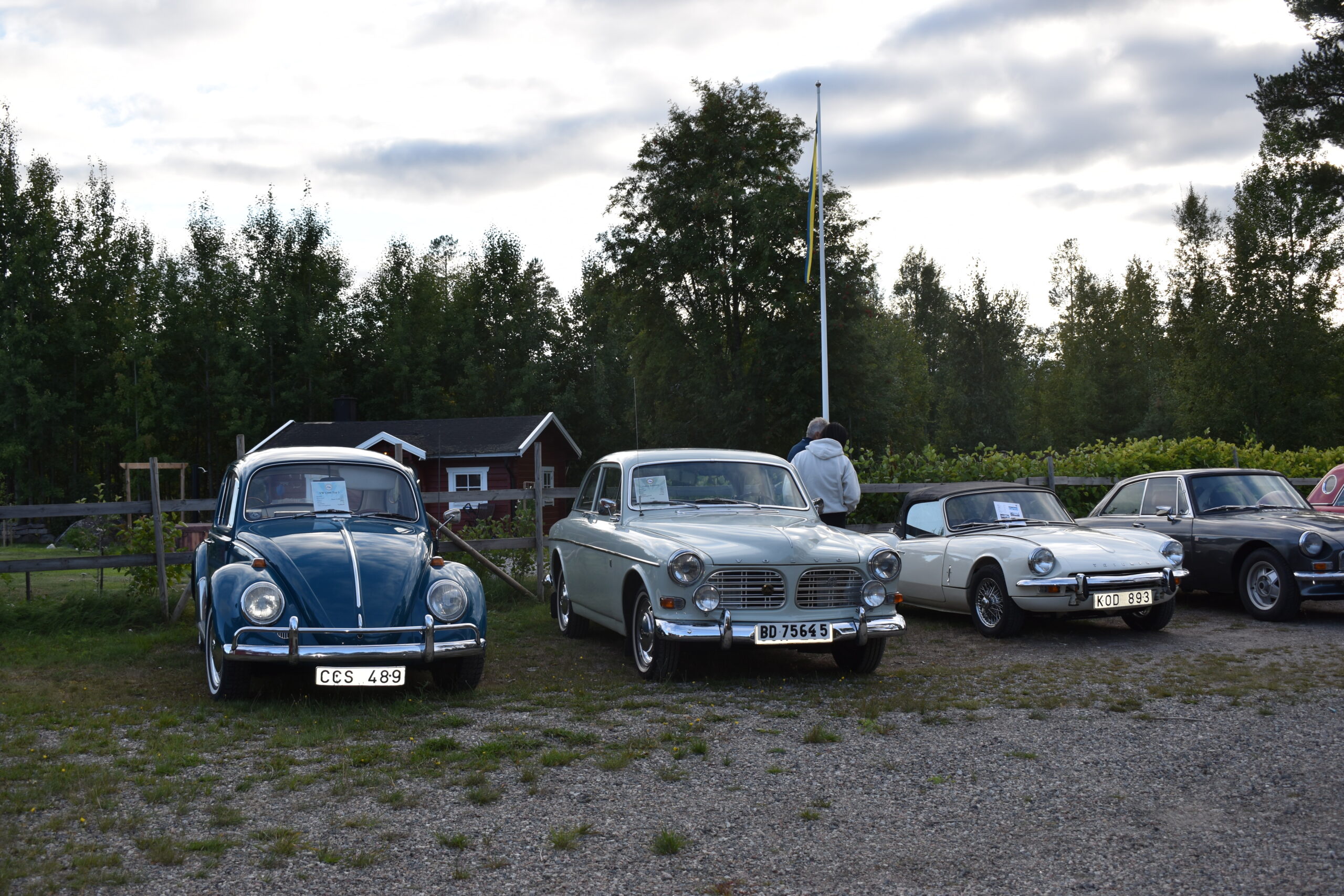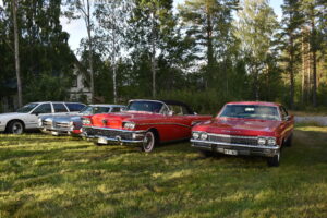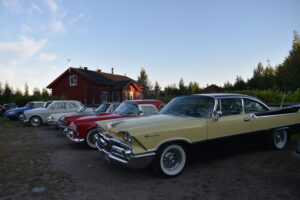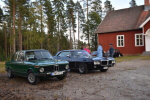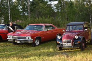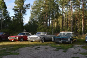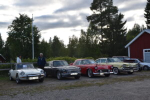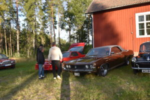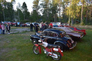 Efter en gråmulen förmiddag tittade solen fram och lyste vackert över Höglandsnäs byagård när bilarna började rulla in. Ett fyrtiotal bilar och ett par tvåhjulingar parkerade i solskenet på gårdsplanen, och en mängd av byns innevånare letade sej också dit för att titta på våra fordon och surra med oss - trevligt med sådan uppslutning. Byaföreningen serverade stor fikabuffé, som hade en strykande åtgång - det var hela tiden fullt runt fikaborden, och av ljudnivån att döma verkade alla ha trevligt. Mätta och nöjda minglade vi sen runt på gårdplanen bland bilar, mopeder och glada människor. En härlig kväll med vackert väder, vackra fordon och trevliga människor. Tack till alla som kom, och tack till Höglandsnäs Byaförening för att vi fick komma.